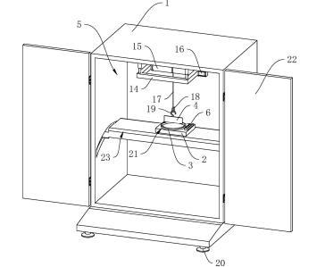 参照图1,包括壳体1、工作台2、盛液盒3和标准板4,壳体1内设置有工作腔5,壳体1底部设置有多个支撑脚20,在本申请实施例中,支撑脚20设置为四个,四个支撑脚20设置于壳体1的四角位置;壳体1上铰接有两转动门22;工作台2设置于工作腔5内,工作台2上开设有与盛液盒3适配的放置槽21,盛液盒3可放置于放置槽21中,标准板4设置于盛液盒3上方,标准板4通过升降结构可升降连接于壳体1上,工作台2上固定连接有水平仪6,在本申请实施例中水平仪6选用气泡式水平仪,也可选择其他体积较小的水平仪;工作台2和壳体1之间设置有用于调平工作台2的调平结构。