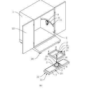 参照图2和图3,调平结构包括调节板7、齿轮一8、齿轮二9和用于驱动齿轮二9转动的旋钮10,调节板7转动连接于壳体1内,壳体1上开设有供调节板7移动的滑槽11,调节板7的底面呈弧形凹面12设置且弧形凹面12上开设有齿槽13,调节板7顶面的两侧边倒有倒角23;齿轮一8和齿槽13啮合;齿轮一8和齿轮二9均转动连接于壳体1上,齿轮一8和齿轮二9啮合,齿轮二9的齿数小于齿轮一8的齿数,从而达到一个减速的作用,旋钮10设置于壳体1外。