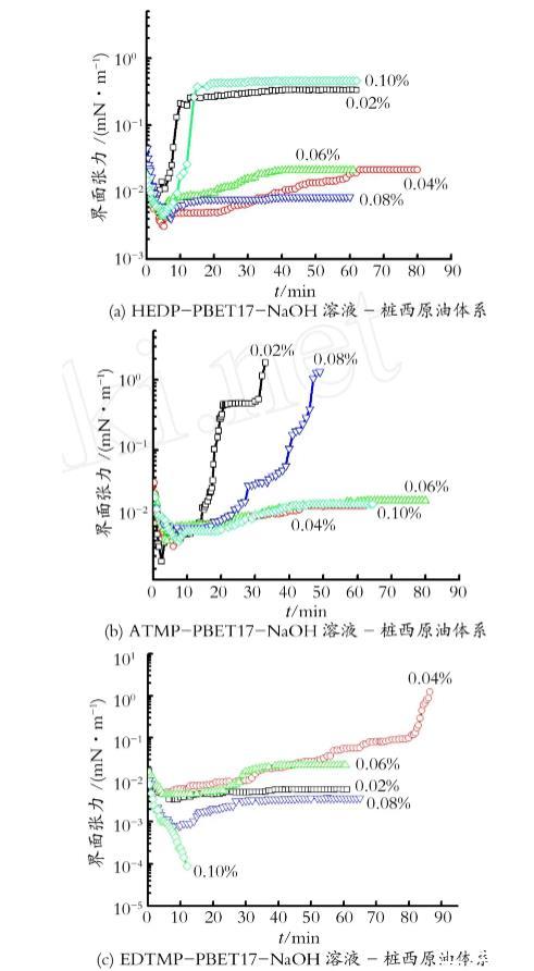 图5 HEDP-PBET17-NaOH,A TM P-PBET17-NaOH,EDTM P-PBET17-NaOH溶液-桩西原油体系的动态界面张力