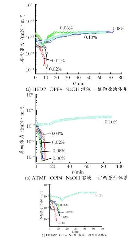 图4 HEDP-OPP4-NaOH,A TM P-OPP4-NaOH,EDTM P-OPP4-NaOH溶液-桩西原油体系的动态界面张力
