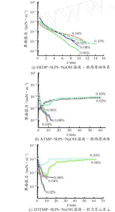 图3 HEDP-SLPS-NaOH,A TM P-SLPS-NaOH,EDTM P-SLPS-NaOH溶液-桩西原油体系的动态界面张力