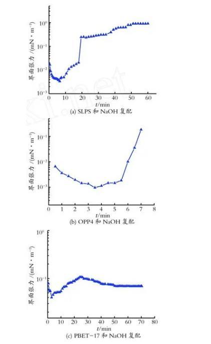 碱与表面活性剂复配有一定的协同效应,但使用高浓度碱容易引起结垢等问题,实验选用低浓度的NaOH(质量分数为0.1%)与SLPS、OPP-4和PBET-17进行了复配,测定了其油-水动态界面张力,如图2所示。