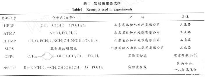 在化学驱提高采收率方法中,表面活性剂/碱复合驱的驱油效果比较好,这主要是由于碱与原油中酸性物质反应生成的活性剂与外加表面活性剂产生了协同效应,可以将油水界面张力降至低界面张力区域(10-2m N/m)甚至超低界面张力区域(10-3m N/m),并且碱可以降低活性剂在地层中的吸附。但在高碱浓度下,注入碱容易对驱油体系造成采出液处理困难、引起地层黏土分散和运移、导致地层渗透率下降等负面作用,并且碱也与油层流体及岩石矿物反应,形成碱垢,对地层造成伤害并影响油井正常生产。解决结垢问题的主要方法是加入化学防垢剂,其中有机膦酸盐防垢剂因其良好的防垢效果而有广泛的应用。