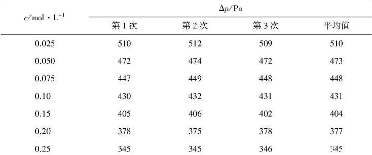 ⑥按照上述方法测定不同浓度正丁醇溶液的Δpmax值。不同溶液测定时须按低浓度到高浓度的次序测定;测定每一样品时只需要用同样浓度的溶液淌洗3次即可,并对测量数据进行记录(例见表1)。