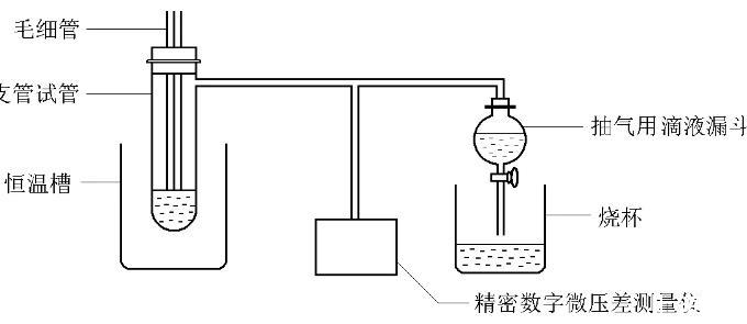 仪器:AF-02型数字式微压测量仪,数控恒温槽,5mL和10mL移液管各一支,碱式滴定管1支,50mL容量瓶9个,样品管1个,毛细管1个,抽气瓶1个,锥形瓶1个,玻璃漏斗1个。
