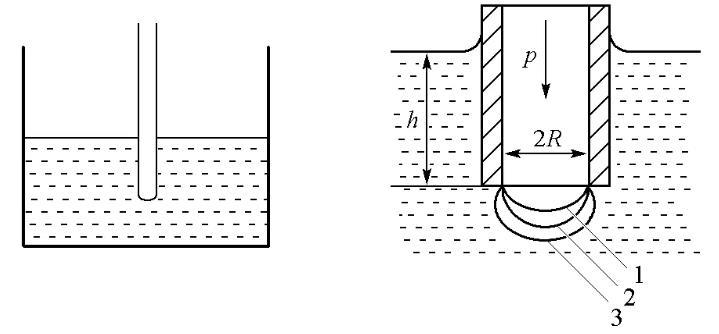 由于最大气泡压力法的器材易得,且易于学生理解表面张力的原理,因而一直是教学中测定液体表面张力的一种常用方法[2]。如图1所示,测定时将一根毛细管插入待测液体内部,从管中缓慢地通入惰性气体对其内的液体施以压力,使管端形成气泡逸出。当所用的毛细管管径较小时,可以假定所产生的气泡是球面的一部分;但是在气泡生成及发展过程中,气泡的曲率半径会随惰性气体的压力变化而改变。当气泡的形状恰为半球形时,气泡的曲率半径最小(即毛细管半径R),此时根据Laplace方程,管内外压差达最大,其值Δpmax=p-ρgh可由差压计测量得到[3]。利用最大压差和毛细管半径即可计算表面张力σ: