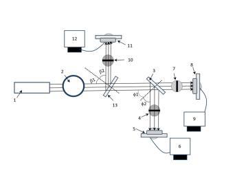 第一分束镜13与第二分束镜3之间的距离为5厘米,第二光阑7与第二分束镜3之间的距离为5厘米,第二光阑7与第二光电探测器8之间的距离为5厘米。第三光阑4与第二分束镜3之间的距离为5厘米,第三光阑4与第三光电探测器5之间的距离为5厘米。入射光与分束镜法向之间的夹角为,分束镜法向与反射光之间的夹角为。,。