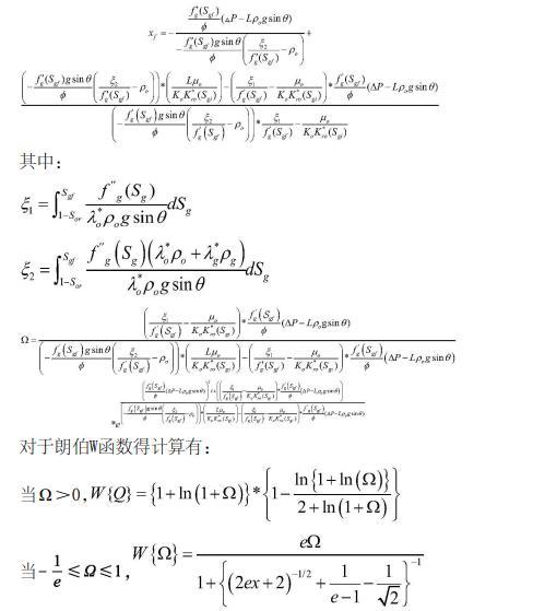 将速度场方程与气体分流率方程结合,在遵循气体质量守恒的基础上,从CO2入口端到混相带前缘对含气饱和度进行积分,并用朗伯W函数求解得出混相前缘的位置,其表达式如下: