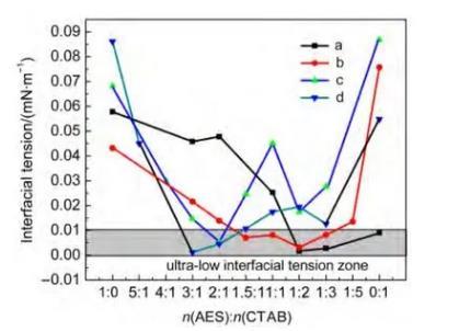 按照阴阳离子表面活性剂:非离子保护剂摩尔比为4:1的比例,在总表面活性剂含量不变的情况下,变化AES/烷基季铵盐CTAB的混合比例进行研究。实验结果显示,阴阳离子表面活性剂复配体系的沉淀得到很好的控制,在七中、石西、陆九、莫北四个实际油水体系中获得了较大范围的超低界面张力区间(图1)。从而证明了XVDEVIOS官方下载免费版采用的三组分策略可有效帮助阴阳离子表面活性剂复配体系实现超低界面张力。