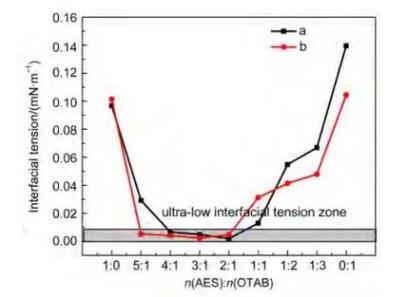 图2烷基季铵盐OTAB/AES/T三组分体系在克拉玛依油田中的油/水界面张力