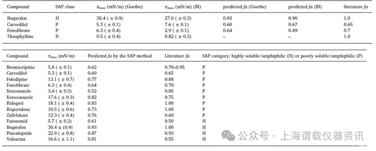 在LCs(先导药物)的早期研究中,只有少量的化合物可用,如果化合物是两亲性的,SAP方法似乎是获得fa的一个有效且快速的工具。只需要少量的LC原液的解决方案(50μl)通过Delta-8仪器进行分析,而没有采用进一步分析如高效液相色谱法分析,高效液相色谱法尽管其简单,能够预测广泛化合物的药物的生物利用度(fa),包括高溶性和低溶性的两亲性化合物。而对于难溶性和高溶性两亲性化合物,改进的SAP(表面活性谱法)预测fa值与文献报道的药物分子的fa值相近。但是此方法不适合预测非两亲性药物的fa值。