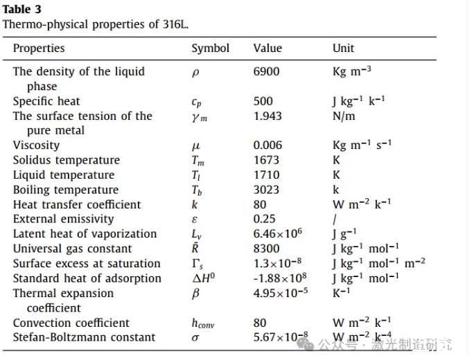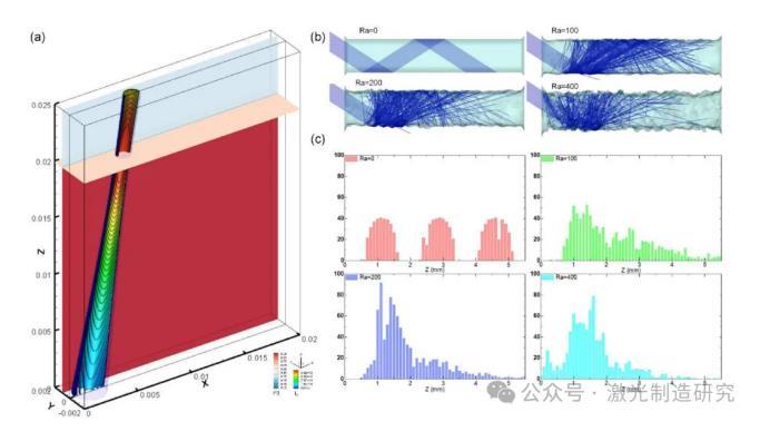 图1(A)中显示了计算领域的图形说明。计算域的大小设置为20 mm×2 mm×25 mm。计算域划分为1.25亿个边长为0.02 mm的六面体网格。在初始状态下,将厚度为20 mm的下部设置为工件层(阶段2),将厚度为5 mm的上部设置为环境空气层(阶段1)。前壁(Y=0)被设置为对称边界条件,顶面(Z=25 mm)被设置为压力输出边界条件,其他表面被定义为壁边界条件。使用了Ansys-FLUENT®软件用于模拟。采用C语言编写的用户自定义函数(UDF)实现光线跟踪过程。图1(B)显示了光线追踪过程的验证案例,在该案例中,一束平行光束被射入具有不同表面粗糙度的方腔。图1(C)表明,在高Ra条件下,随着表面粗糙度的变化,能量分布明显改变,更多的能量集中在第一反射区。表3列出了模拟中使用的物理特性。