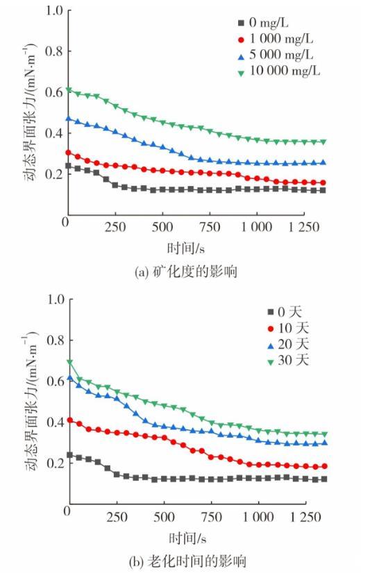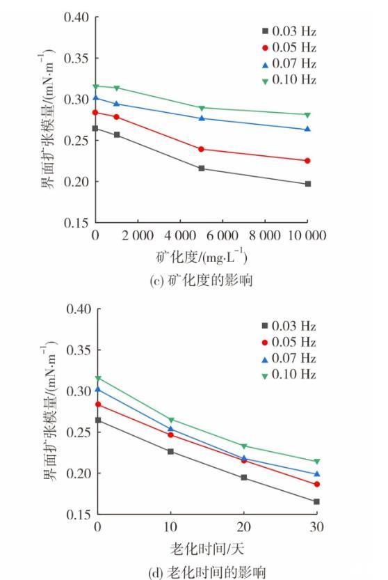 图3为油藏条件对动态界面张力及界面扩张模量的影响。采用不同矿化度模拟水配制体系(0.06%(w)冻胶分散体+0.10%(w)降黏剂),在50℃老化10天。图3(a)和图3(c)呈现了矿化度对体系界面流变性质的影响。从图3可知,随着矿化度的提高,老化后体系的动态界面张力稳定值从0.127 mN/m增至0.356 mN/m。降黏剂带有磺酸盐基团,有较强的耐温耐盐能力,因此界面张力的提升幅度有限。此外,体系的界面扩张模量随矿化度的增大而减低,这是由于地层水阳离子会对冻胶分散体之间的扩散双电层产生压缩作用,减小冻胶分散体表面负电量,降低其分散稳定性,体系黏度随之下降。