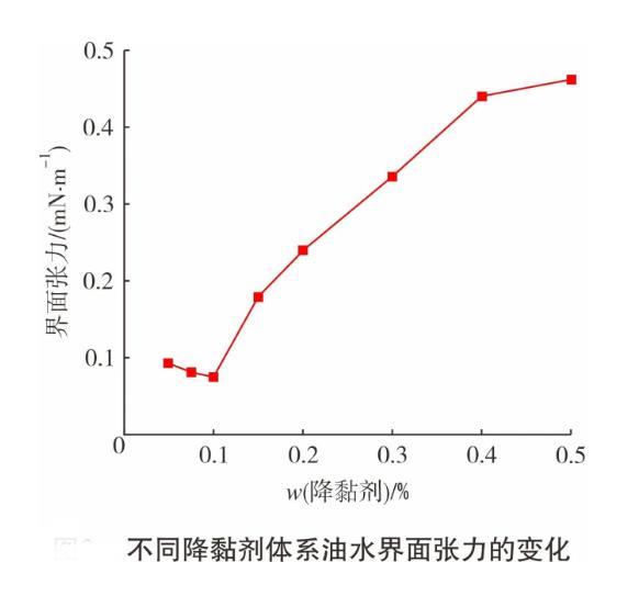 图1为在不同降黏剂质量分数下,体系油水界面张力的变化情况。从图1可知,在降黏剂质量分数为0.05%~0.10%时,界面张力随质量分数增加而降低。当降黏剂质量分数超过0.10%时,界面张力开始上升。在低质量分数下,降黏剂在油水界面上形成吸附膜,降低界面张力。当降黏剂质量分数超过临界胶束含量后,降黏剂在界面聚集数量增加,吸附层排布更不规则,导致界面张力升高。