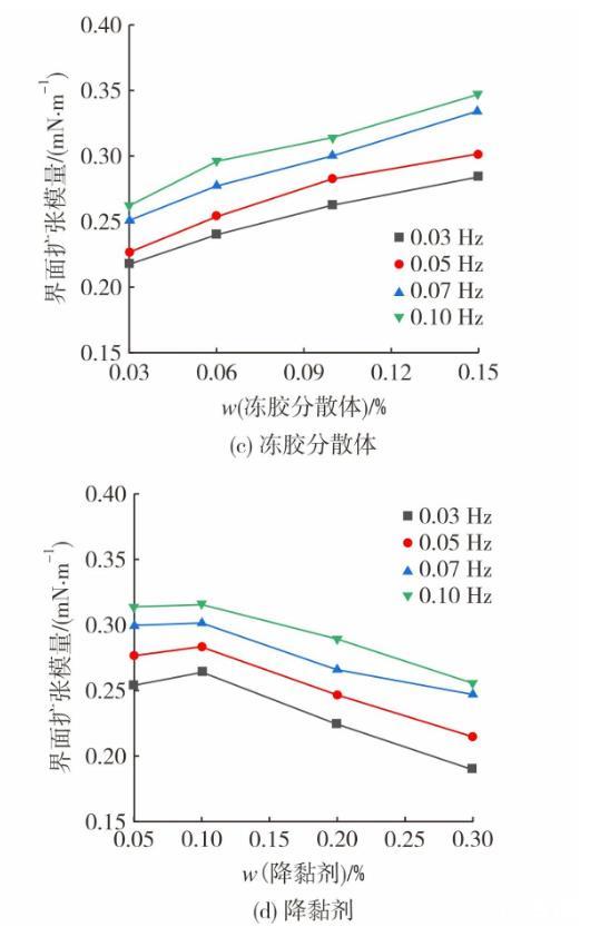 图2为体系组成对动态界面张力及界面扩张模量的影响。图2(a)和图2(c)呈现了冻胶分散体质量分数对界面流变性质的影响。其中,降黏剂质量分数保持为0.10%。随着振荡时间的增加,体系界面张力逐渐趋于稳定。冻胶分散体在高质量分数时,稳定界面张力明显更高,这是由于在降黏剂质量分数不变时,油水界面上降黏剂分子数量相对固定冻胶分散体在油水界面的吸附量随质量分数增大逐渐增加,挤占了降黏剂分子在界面吸附位置。同时,由于体系黏度上升,降低了降黏剂向界面扩散的速度,导致界面张力增加。体系黏度提高,增加了动态扩张模量,在高质量分数冻胶分散体条件下,黏弹性提升效更加显著。