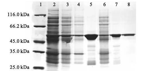 图1失活型VhPLD的表达与纯化SDS-PAGE电泳图注:1.蛋白marker;2.菌体破碎液;3.菌体破碎后离心所得上清液;4.菌体破碎后离心所得沉淀;5.镍柱纯化所得100 mmol/L咪唑洗脱峰样品;6.镍柱纯化的上样穿过峰样品;7.G-25柱纯化的洗脱峰样品;8.Q柱纯化的300 mmol/L氯化钠梯度洗脱峰样品。