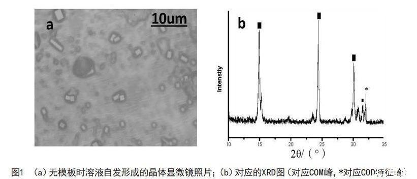 采用XRD表征草酸钙的成分;收集在十八胺LB膜上的晶体和溶液自发生成的晶体,用金相显微镜表征。