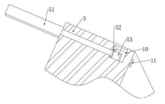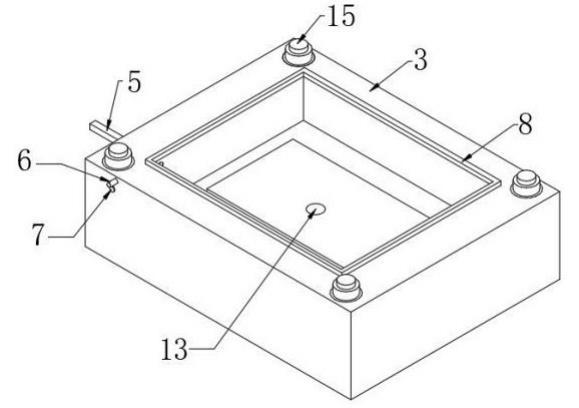 1、上模具;2、注塑口;3、下模具;4、收纳槽;5、阻挡部;6、外接管;7、检测器;8、修整片;9、放置槽;10、流动通道;11、通气孔;12、热流部;13、出料液压杆;14、连接槽;15、电动伸缩杆;51、气缸;52、密封圈;53、阻挡块;121、热流板;122、加热丝;123、阻隔板。