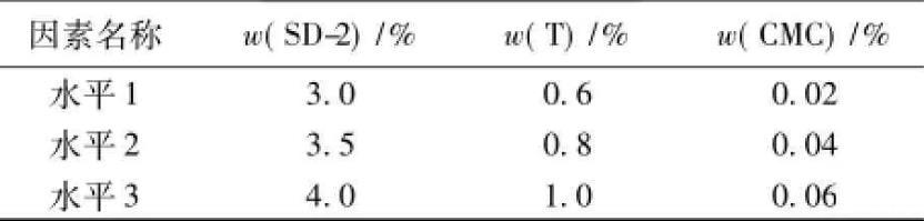 乳化剂SD-2,缔合型增稠剂T和羧甲基纤维钠等是CA砂浆阴离子乳化沥青中最关键的3种组分,对乳化沥青的性能起着决定性的影响。为了比较对油水界面张力和乳化沥青贮存稳定性的影响,采用L9(34)正交试验的方法进行优化设计,因素水平见表1。