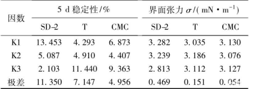 根据正交试验表,配制不同配合比的皂液,调节pH值为11,制备乳化沥青测定其贮存稳定性,并测定不同配合比的皂液与沥青甲苯模拟油的界面张力,结果见表2。对试验结果进行对比分析和极差分析,结果见表3。
