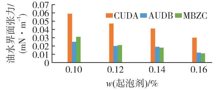 由图3可知:随着起泡剂用量的增加,3种起泡剂的油水界面张力逐渐降低,且在质量分数达到0.16%时,油水界面张力降低到最低值,其中AUDB与MBZC型起泡剂的油水界面张力均低于0.02 mN/m,达到低界面张力驱油的要求。