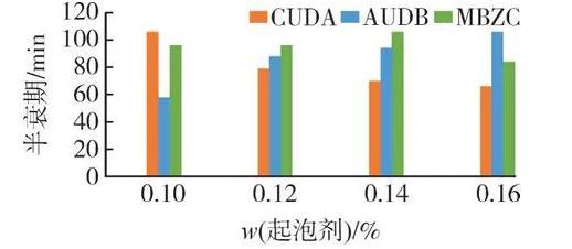 泡沫性能直接关系到起泡剂在地层的封堵效果。目前,油田驱油用表面活性剂工业品主要有阴离子型、非离子型和两性型单独或复配使用,其泡沫性能差别很大。起泡剂的浓度是影响起泡剂活性的重要因素之一,合理的浓度设置必须使其既具有高效的泡沫特性也具有一定的经济性,故选择CUDA、AUDB、MBZC这3种非离子-阴离子型起泡剂,在其质量分数分别为0.10%、0.12%、0.14%和0.16%时,评价这3种起泡剂发泡量、半衰期、泡沫综合指数等性能。