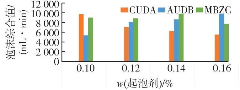 由图2可知:随着起泡剂用量的增加,CUDA型起泡剂的泡沫综合指数逐渐下降;AUDB型起泡剂的泡沫综合指数逐渐升高,且在质量分数达到0.16%时达到峰值9 762 mL·min;而MBZC型起泡剂的泡沫综合指数先上升后下降。由此可见,AUDB型起泡剂的泡沫强度最高。