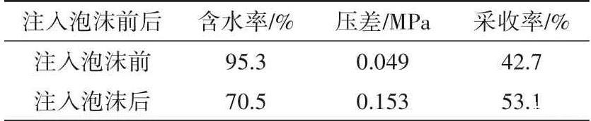 由表1可知:在注入泡沫前,采出液的含水率达到95.3%,在向胶结岩心中注入0.3 PV的泡沫流体后含水率显著下降到70.5%,注入泡沫流体前后压差达0.104 MPa,说明AUDB型起泡剂混合氮气形成的泡沫具有良好的封堵效果。注入泡沫流体后,采收率明显提高,由42.7%提高至53.1%,说明AUDB型起泡剂具有良好的洗油效果。
