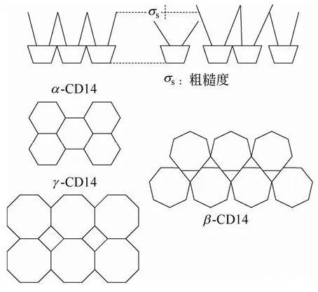 为了考察环糊精种类对所制备LB膜结构的影响,Schalchli等用X-Ray反射技术对3种两亲性环糊精(α-、β-、γ-)在硅片上形成的LB单分子膜结构进行了研究。结果显示,所有两亲性环糊精都在基底上形成了单分子层,但两亲性α-和γ-环糊精LB膜的结构相似,而β-环糊精LB膜的结构与前两者有很大的不同。并且两亲性β-环糊精LB膜的粗糙度也远远大于两亲性α-和γ-环糊精。以上不同的原因缘于β-环糊精的七边形环不同于α-,γ-环糊精的六或八边形环是对称结构,从而不能像α-,γ-环糊精那样在基底上形成有序的结构,如图1所示。类似地,Alexandre等用扫描力显微镜(scanning force microscopy)考察了两亲性α-,β-,γ-全叠氮基环糊精在云母片上的LB膜的结构。无论在纳米尺度还是在微米尺度下观察,β-全叠氮基环糊精匀呈现出不同的形貌。