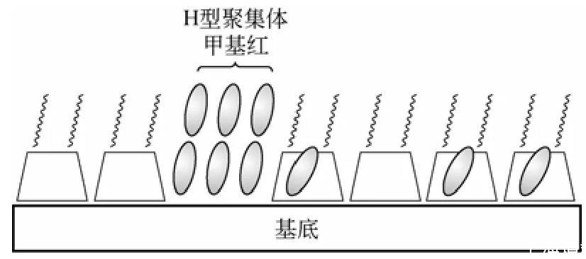 两亲性环糊精不仅能够单独组装成LB膜,也能够和其他有机分子共同组装成杂化LB膜。Matsumoto课题组在两亲性环糊精和偶氮苯LB杂化膜方面做了大量的工作。因为偶氮苯化合物能够在光照条件下发生可逆的顺反光异构反应,若将偶氮苯在固体基底上进行组装将对光储存、光转换器件的发展具有十分重要的意义。但是由于在单纯LB膜中,偶氮苯分子周围自由体积很小,限制了顺反光异构反应的发生,而利用两亲性环糊精和偶氮苯杂化组装成LB膜以解决这个问题。研究表明部分偶氮苯被包结在环糊精的空腔中,空腔为水溶性偶氮苯发生可逆的光异构化反应提供了良好的场所。此外,环糊精疏水链段也能够成为容纳客体分子的场所,而且在膜中并非所有的环糊精分子都会包结偶氮苯分子,剩余的未包结环糊精为进一步功能化提供了基础。但是在该杂化膜中会有部分偶氮苯分子形成的聚集体(图2),所以进一步增加杂化分子的包结率和分散性是这一类杂化膜的研究方向。