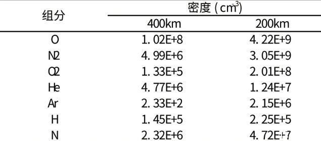 众所周知,低地球轨道气体主要成分是原子氧,占地轨道气体总数的80%以上,而超低轨气体环境与低轨有很大不同,其成分主要是分子氮(N)和原子氧(O)。表1给出了不同轨道高度下大气组分密度的变化,从表中明显看出,在400 km轨道,原子氧(O)的密度为1.0E+8 cm-3,比分子氮(N)密度高两个数量级4.99E+6 cm-3;而在00 km轨道,原子氧(O)的密度为4.E+9 cm-3,分子氮(N)密度与其在同一数量级3.05E+9 cm-3。