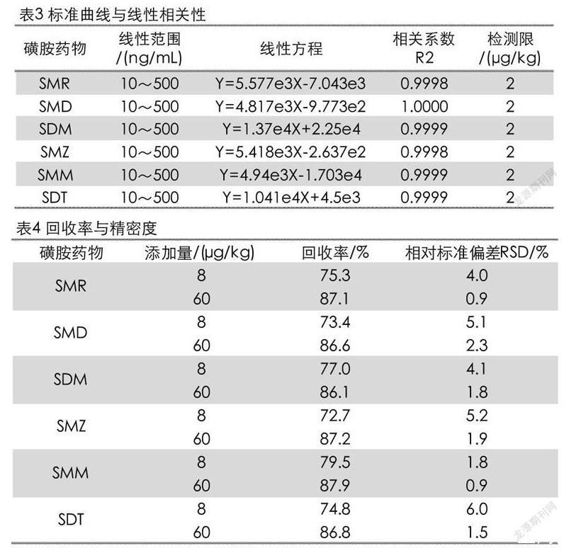 制备混合标准浓度系列,分别为10、50、100、250和500 ng/mL(分别相当于被测组分的含量为2、10、20、50和100μg/kg)。将标准工作液按照2.3.3的方法进样测试。以进样浓度为横坐标,以峰面积的响应值为纵坐标绘制标准曲线,结果如表3所。6种磺胺类药物在浓度10~500 ng/mL范围内线性关系很好,相关系数R2≥0.9998。