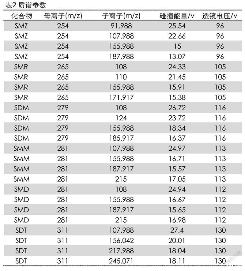 6种磺胺类标准物质:磺胺甲恶唑(SMZ)、磺胺甲基嘧啶(SMR)、磺胺间二甲氧嘧啶(SDM)、磺胺间甲氧嘧啶(SMM)、磺胺对甲氧嘧啶(SMD)、磺胺地索辛(SDT)(纯度均大于99.5%,北京振翔科技有限公司);乙腈(色谱纯,德国Merck公司);甲酸(色谱纯,上海安普实验科技有限公司)。