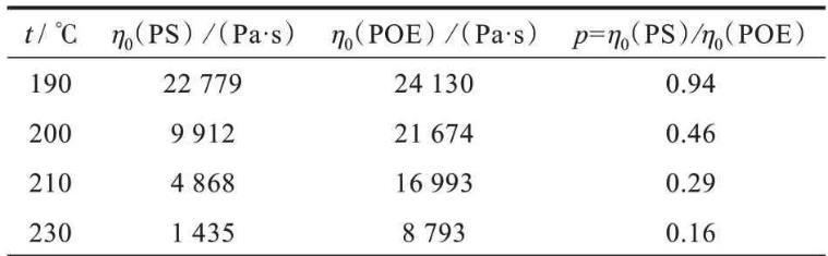 表1不同温度下POE和PS的零剪切黏度和黏度比