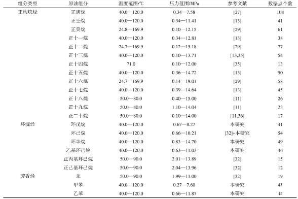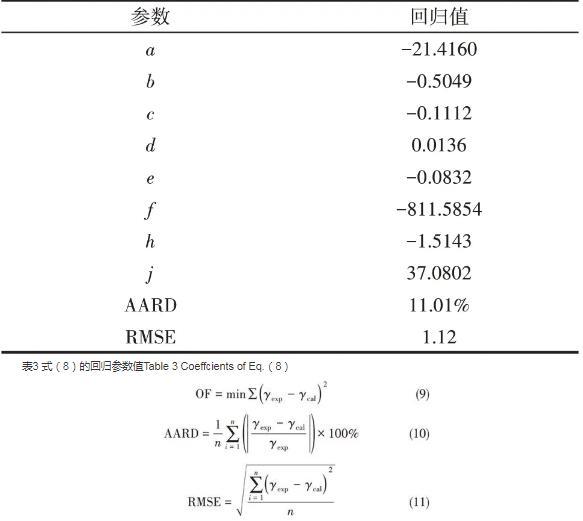 2.4.2实验数据回归及模型参数的求取本研究系统收集了文献数据,并将研究测定的实验数据,共计932个数据用于回归,回归所用数据见表2。回归参数由最小二乘法得到,其目标函数如式(9)所示。采用平均相对偏差(AARD)和均方根误差(RMSE)表示计算效果,如式(10)、式(11)所示。回归结果见表3。