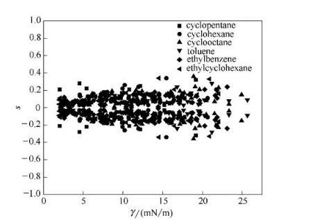 用于拟合的全部数据中,86.4%的数据的平均相对偏差在20%以内。界面张力小于5 mN/m时,偏差较大。式(8)对于CO2-正构烷烃/芳香烃/不带支链的环烷烃/芳香烃体系的拟合结果较好,对于CO2-带支链环烷烃体系拟合结果相对较差。