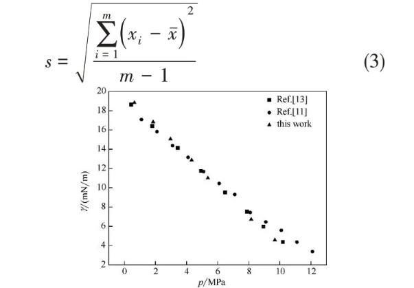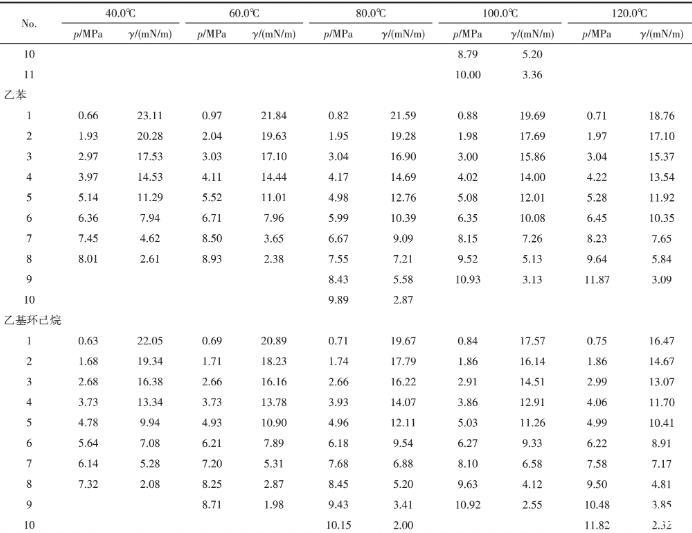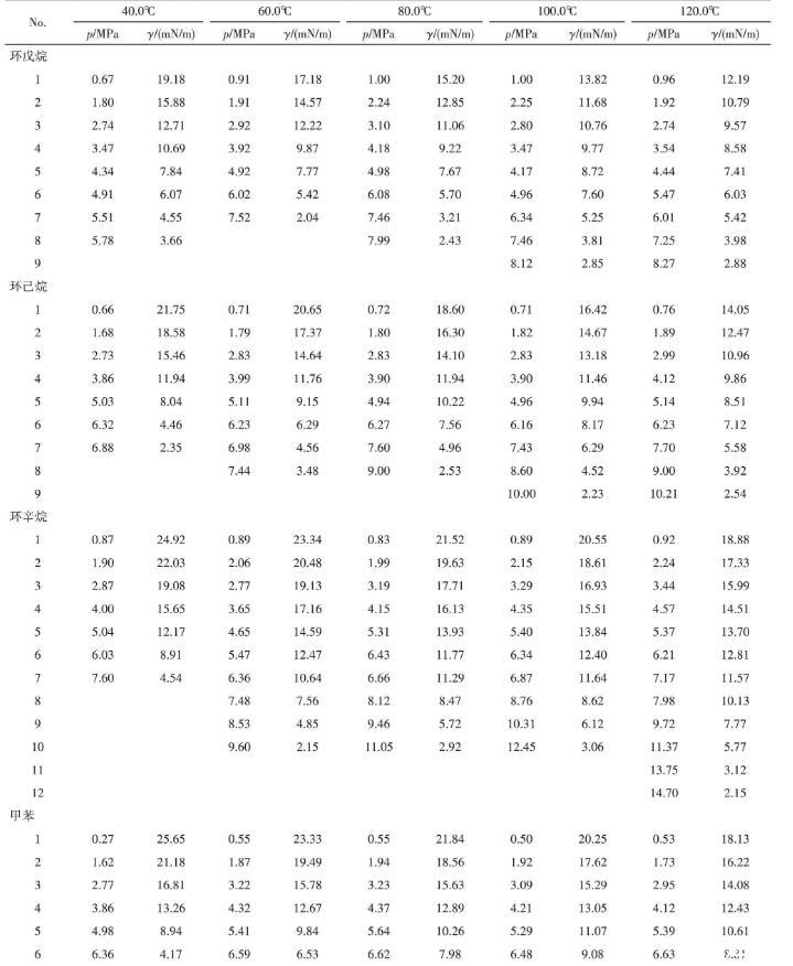 本研究测定了CO2-环戊烷/环己烷/环辛烷/甲苯/乙苯/乙基环己烷体系的界面张力,测量的温度范围为40~120℃,压力范围为0.27~14.70 MPa。实验数据见表1。并绘出实验数据的标准差图,结果如图3所示。结果表明,所有数据的标准差均在0.36 mN/m以内,证明数据的准确性较好。其中,标准差的计算如式(3)所示