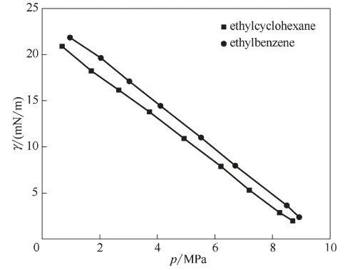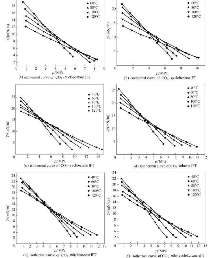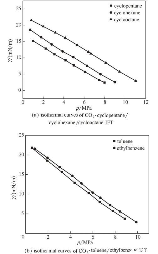 图6 CO2-相似结构(环烷烃/芳香烃)界面张力的等温线