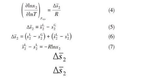温度对界面张力的影响比较复杂,首先温度影响界面张力随压力的下降速度,随着温度的升高,界面张力下降速度越来越缓,使得不同等温线在某个压力范围内有交叉点;其次,不同区域内,温度对界面张力的影响不同。在交叉点以上,界面张力随温度的升高而减小,而交叉点之下,界面张力随温度的升高而增大。为了分析温度对CO2溶解度的影响,将Gibbs-Helmholtz方程计算的溶解度对温度的导数与偏摩尔熵联系起来,如式(4)~式(7)所示