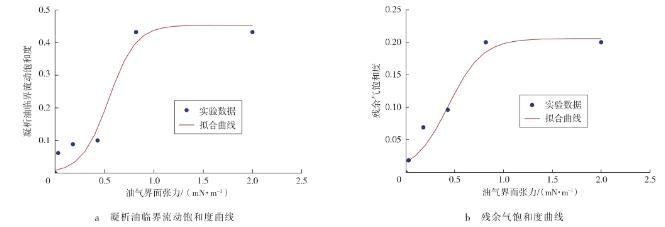 3)界面张力影响减弱阶段。当油气界面张力大于某个值时(见图2d—2e),随着界面张力的增大,凝析油气相对渗透率曲线的曲率逐渐恒定,界面张力对凝析油气渗透率和凝析油气临界流动饱和度的影响变小,此时曲线形态与高界面张力下的氮气和煤油相对渗透率曲线类似(见图2f)。