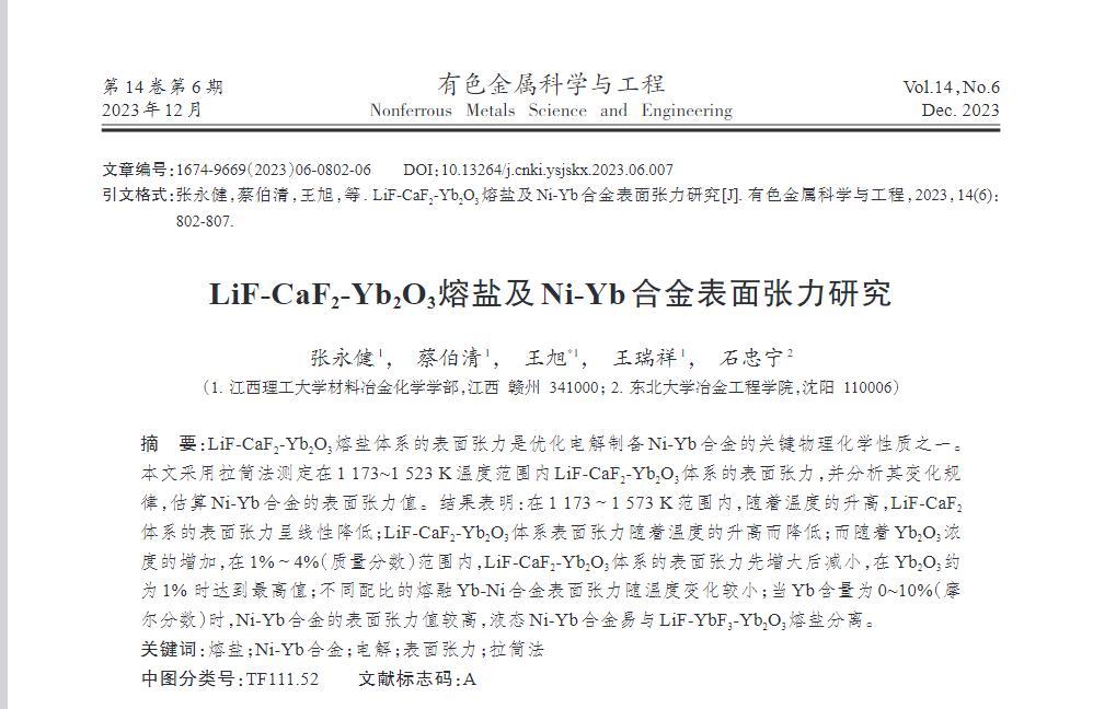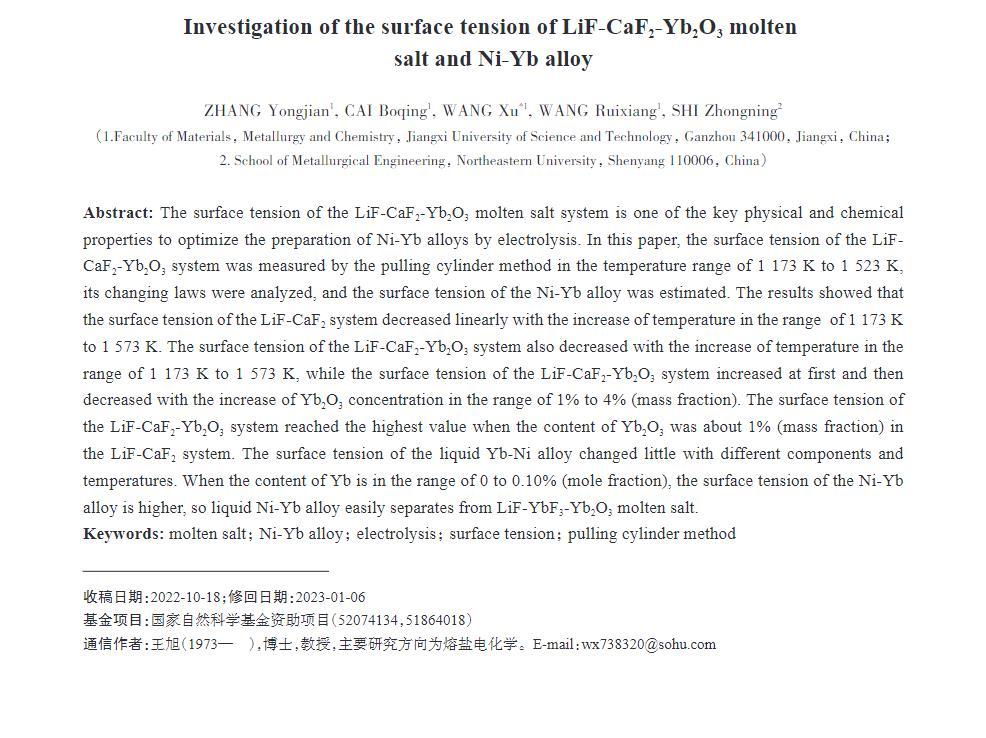 LiF-CaF2-Yb2O3熔盐体系的表面张力是优化电解制备Ni-Yb合金的关键物理化学性质之一。本文采用拉筒法测定在1173~1523 K温度范围内LiF-CaF2-Yb2O3体系的表面张力,并分析其变化规律,估算Ni-Yb合金的表面张力值。