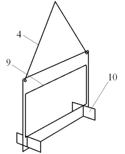 拉力框的设计是本次测试能否成功的关键之一,其结构如图3,与通用的拉力框有很大不同。其形状如汉字中“口”字的形状,由厚0.25mm薄铝片制成。上部底缘称之为刀口(9),长l=50mm,刀口与液面接触后拉起液膜(2)。拉力框两侧各宽3mm,其作用是保持拉起的液膜的稳定,使之不会过早断裂。拉力框底部设有张开的与框面垂直的翼片(10),可防止拉力框摆动。拉力框通过轻软细线悬挂于力敏传感器(5)上,通过拉动悬线(4),可调整拉力框与液面的平行度。