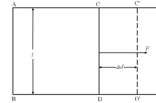 研究液体表面张力随液体浓度、温度、压强等的变化规律的论著很多,却很少有人研究液体表面张力随液面拉伸程度的变化规律,从而隐喻了一种结论,即液体在浓度、温度、压强等条件不变时,其表面张力的大小不会随其表面被拉伸的程度而改变。多部专著都有这样的经典的论述,图1所示的矩形金属丝框覆有液膜,其中CD为活动边,长为l,欲使体系平衡,必须施以适当的力F于CD边上。CD边在力F作用下克服液膜表面张力的阻碍而移动距离Δd,对体系做功ΔA=F×Δd,F=2γ×l,γ=F/2l为CD边的液体表面张力系数。在此论述中,先验地将液体表面张力视为不随液膜面积变化而改变的恒量。