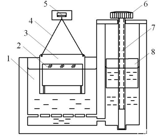 新型表面张力测试仪基本结构如图2所示,该仪器盛有液体(1),仪器采用连通器结构,截面积较大的左端放置拉力框(3),截面积较小的右端设有升降块(8),旋动栓钮(6)和螺杆(7),可使升降块(8)上升或下降,从而引起液面相应的但速度更缓慢的升降。为减小液面升降时的波动,容器的两端通过若干均匀分布的小孔相连通。为便于观测液面位置,容器壁采用透明的有机玻璃材料,通过读数显微镜确定液面高度。