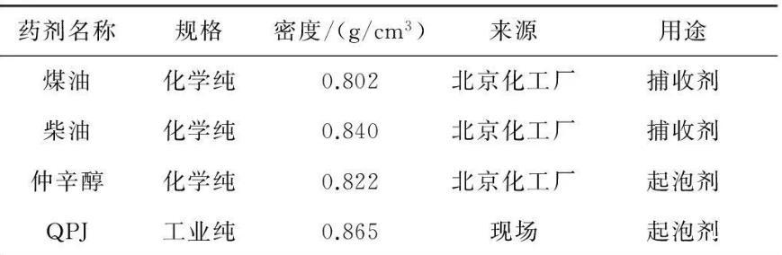 浮选药剂有煤油、柴油、仲辛醇和QPJ,其基本性质及用途见表1。