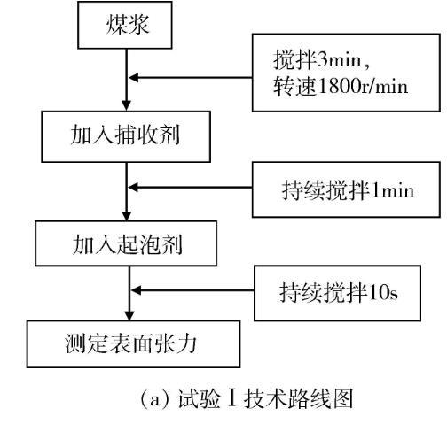 试验分为试验Ⅰ和试验Ⅱ两部分。在试验Ⅰ中,先后改变捕收剂和起泡剂用量,对添加浮选药剂后煤浆的表面张力进行测定,以研究浮选药剂用量对煤浆表面张力影响的规律。在试验Ⅱ中选用煤油/仲辛醇做捕收剂/起泡剂,先后改变煤油和仲辛醇的用量,按照《GB/T 4757-2013煤粉(泥)实验室单元浮选试验方法》对马兰2#煤泥进行浮选试验,并在浮选充气前对煤浆同步进行表面张力的测定,进一步对浮选过程中浮选药剂量、煤浆表面张力及浮选效果之间的关系进行探索。试验控制煤浆浓度为100 g/L,温度为22±0.2℃;使用一次去离子水(pH值为7.0±0.2)。试验技术路线见图1。