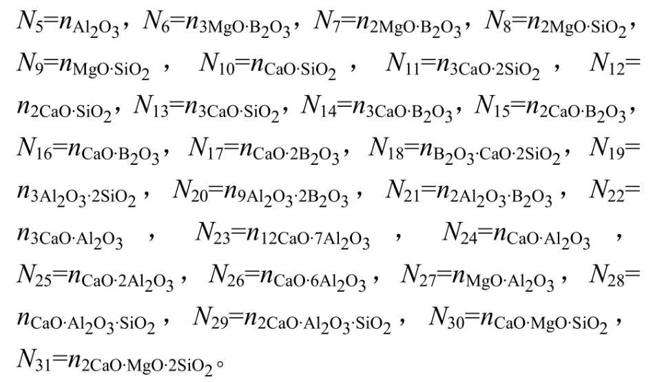 因此,由表1和式(2)~(7)建立计算MgO-B2O3-SiO2-CaO-Al2O3渣系中结构组元和离子对作用浓度Ni的控制方程,其中N6~N31由N1~N5表示出来。在一定温度下,熔渣成分代入该方程组,采用迭代法计算出所有结构组元和离子对的作用浓度。