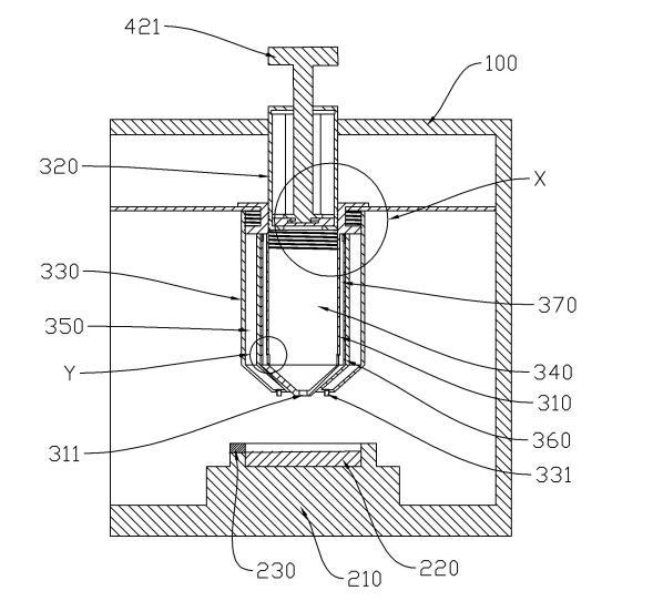 副筒320和滴液筒310之间限定出滴液腔340,滴液筒310上开设有出液口311,滴液腔340与出液口311连通。涂片台200安装于外壳100上,出液口311和涂片台200在第一方向上依次设置,且当出液口311滴出一个待检测液的液滴时,液滴沿第一方向上靠近涂片台200的一端能够与涂片台200接触。外筒330上具有第一空腔350,外筒330上开设有进气口331,进气口331设置在出液口311外侧,进气口331与第一空腔350连通。滴液筒310绕第一方向转动能够分别促使副筒320和外筒330沿第一方向移动,且在进行滴液操作时,副筒320沿第一方向移动能够使滴液腔340体积变小,外筒330沿第一方向移动能够使第一空腔350体积变大。