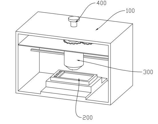 本实施例通过设置外壳100、涂片台200和滴液机构300配合,在进行滴液操作时,使滴液筒310绕第一方向转动,当滴液筒310转动时,将促使副筒320和外筒330沿第一方向移动,且此时副筒320移动使滴液腔340体积变小,外筒330移动使第一空腔350体积变大。而滴液腔340体积变小将使滴液腔340内的待检测液从出液口311挤出,由于滴液筒310绕第一方向转动,因此从滴液腔340内推出的待检测液也将转动,进而使得当待检测液沿第一方向靠近涂片台200的一端与涂片台200接触时,随着滴液筒310的持续转动,将在滴液筒310与待检测液连接的一端形成一个扭转力,进而促使待检测液滴落,避免液滴因其表面张力的作用不容易断开,且在进行滴液操作时,第一空腔350体积变大后,第一空腔350内部将产生负压,进而使外界气体能够从进气口331进入第一空腔350内,而当气体从进气口331经过时,随着滴液筒310的转动,气流将在出液口311的周向方向上产生一个挤压力,进一步促使液滴与出液口311脱离。