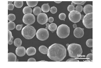 采用扫描电子显微镜对实施例1所制备的雾化粉体进行形貌表征,结果如图1所示。从图1可以看出,雾化粉体的粒径较小,较多的粒径在50μm左右,在雾化粉体表面粘合有金属掺杂剂。